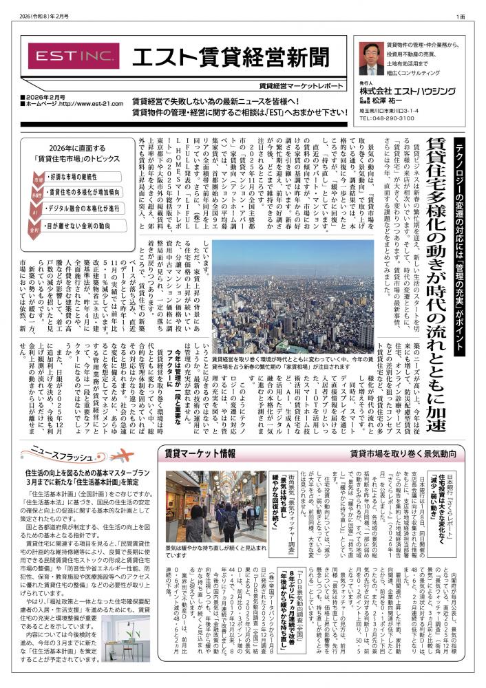 2026年2月号エスト賃貸経営新聞の賃貸経営新聞 | 埼玉の不動産投資・収益物件・建物管理|株式会社エストハウジング
