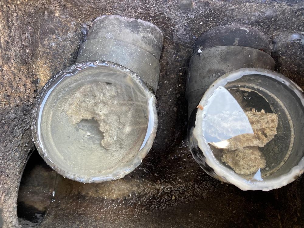 キッチンから流れた油脂分が排水管内で冷却・固化し、蓄積して堆積物(脂の塊)となります。これにより異臭や通水不良が発生します。